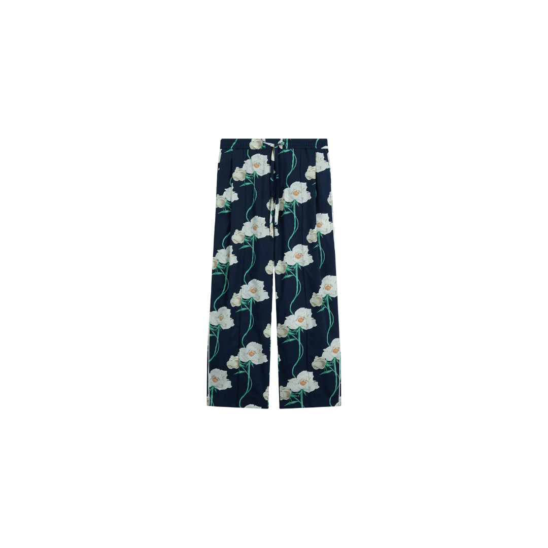 These cotton poplin trousers take their inspiration from pyjamas and feature a floral archive print. The fluid cut and elasticated waist ensure relaxed comfort while maintaining a polished look. Embroidered branding appears on the back pocket. The design pairs with matching pieces from the collection.