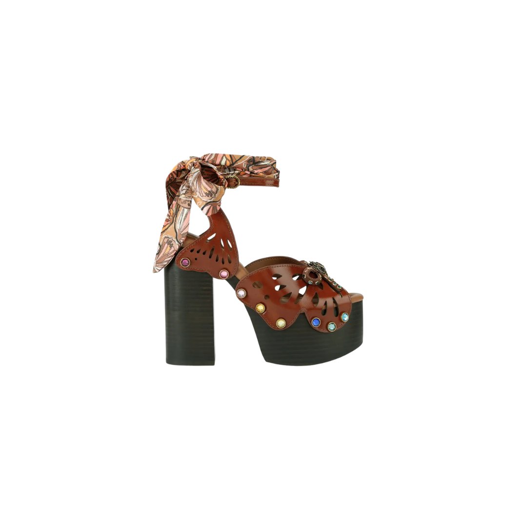 This pair of Butterfly Platform Heels feature a dark brown leather upper with cut outs emulating butterfly wings across the foot that are accented with multi-colour crystals. There is a butterfly satin scarf to wrap around the ankle.