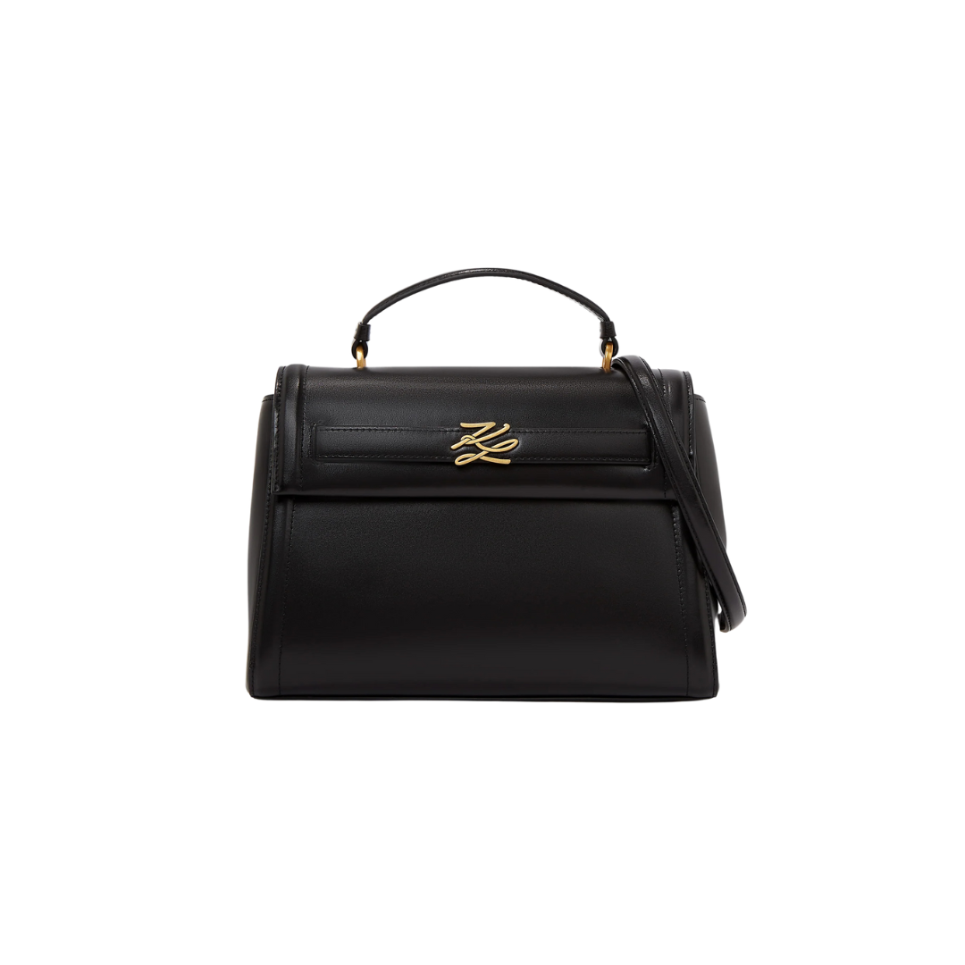 Crafted from premium Italian leather, this timeless top handle bag is accented by elegant Karl Autograph hardware. Featuring a sleek flap closure and a versatile crossbody strap, it blends sophistication with practicality.