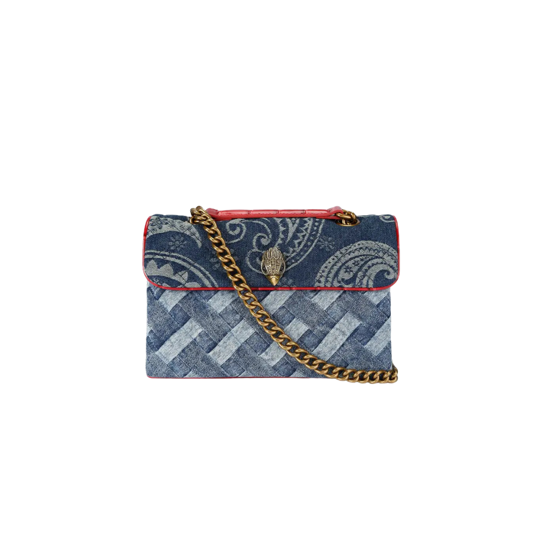 The Kensington Bag is crafted from a denim fabric with paisley bleached print on the upper and weave bleach print on the base. The antiqued brass metal eagle head features crystals on the front flap.