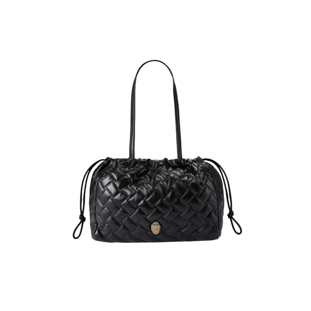 This Kensington String Tote bag is crafted from a soft black leather with overstitch quilting. There is an antiqued brass eagle head on the front.