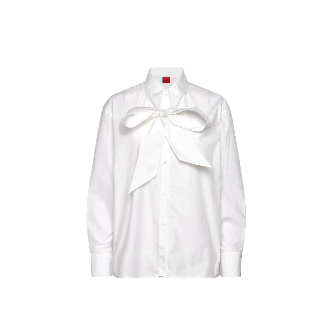 Featuring a tie collar with an embroidered stacked logo, this HUGO Womenswear blouse is a chic everyday option. Straight fit in paper-touch cotton poplin.