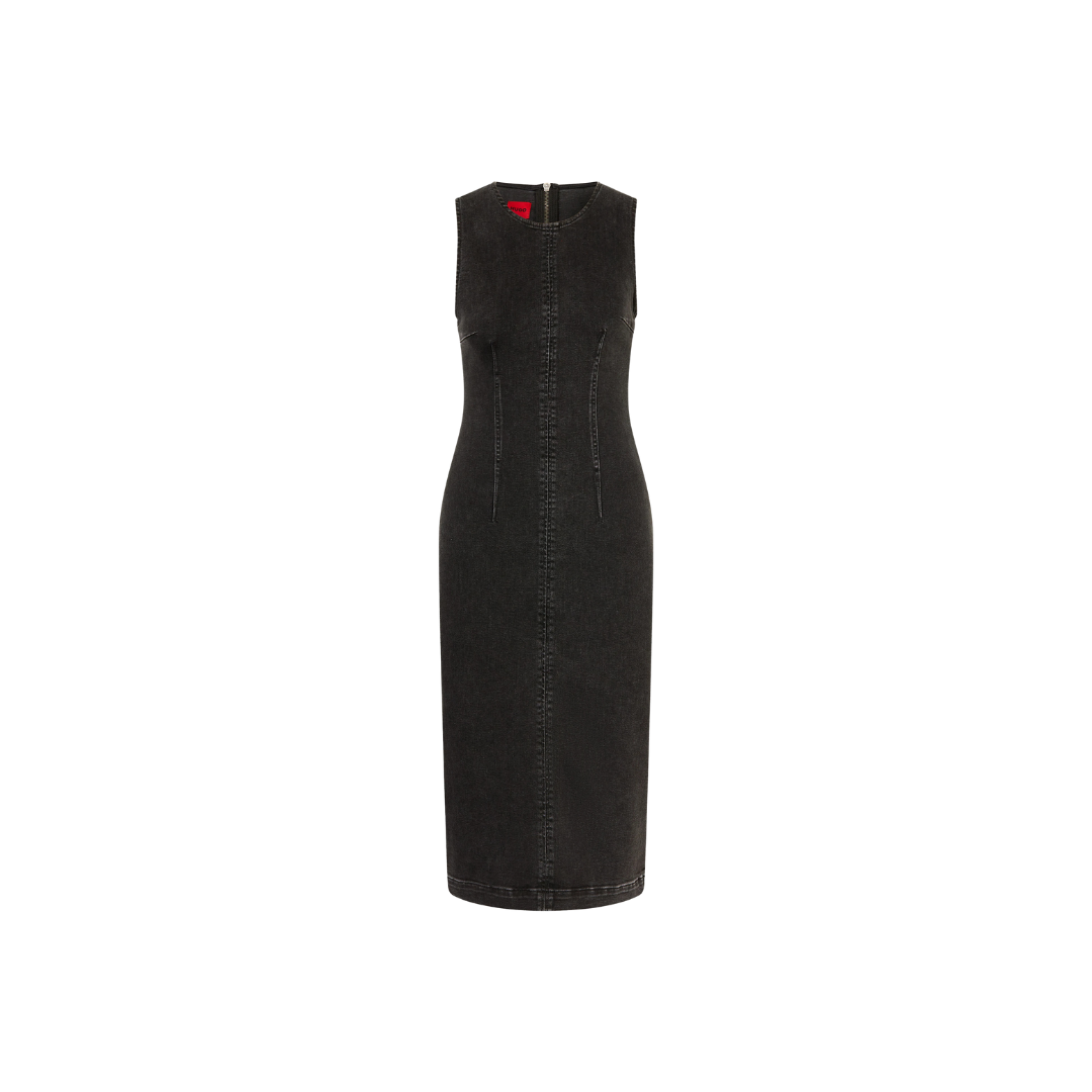Cut in comfort-stretch denim with a raw effect, this HUGO Womenswear bodycon dress features a waist-defining belt. Rear zip with long denim puller.