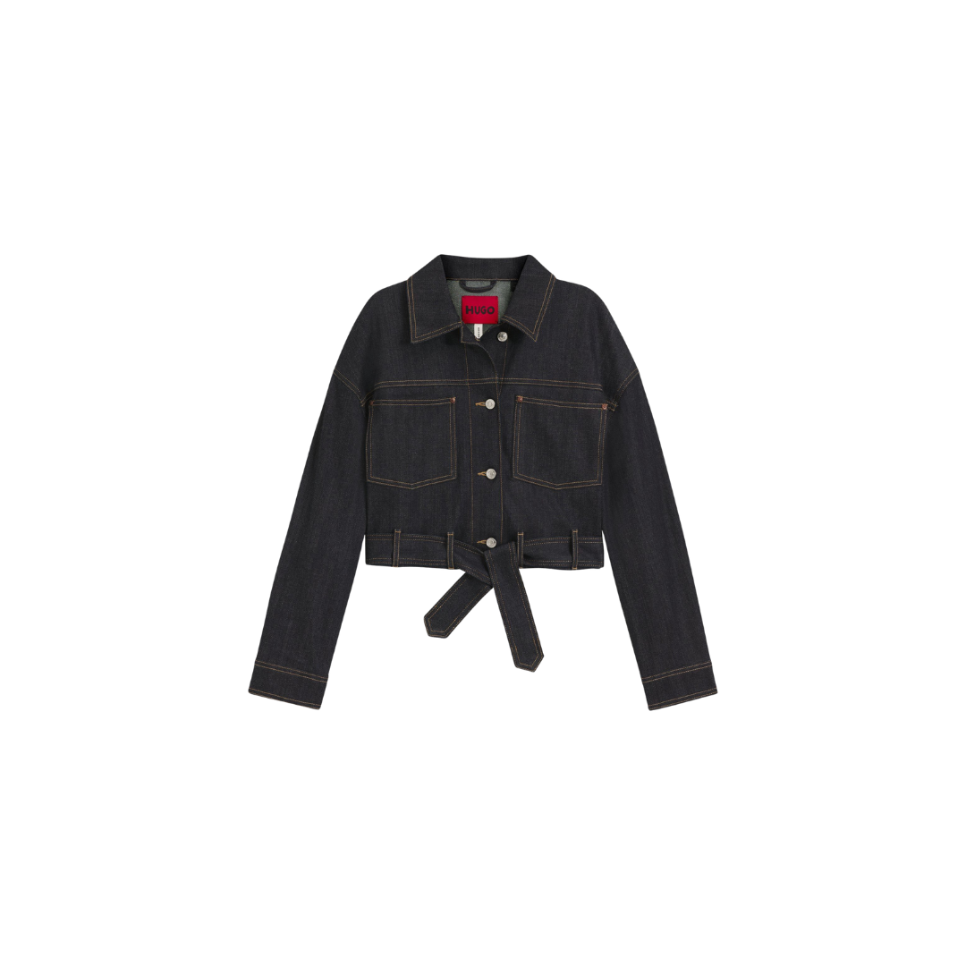 Upgrade your casual collection with the refined Japanese selvedge denim of this HUGO Womenswear jacket. Elegant fabric belt. Cropped profile.