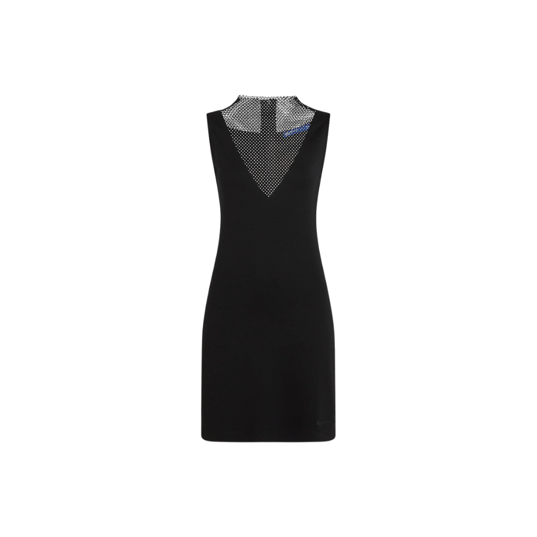 This sleeveless dress with rhinestone mesh at the V-neckline is a sleek reimagining of the little black dress, designed to make a statement.